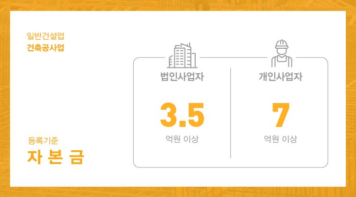 건축공사업 면허 취득을 하기 위한 자본금 법인 3억 5천만원 이상, 개인사업자 7억 이상의 준비가 필요합니다.