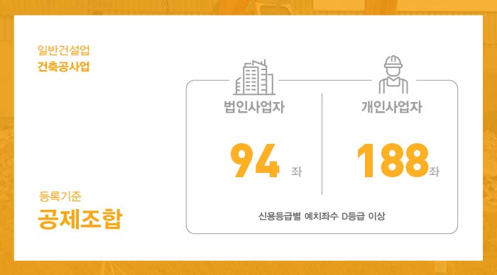 이에 따라 건축공사업은 건설공제조합에 일정 금액을 출자 예치한 후 보증가능금액확인서를 발급받아 면허 신청 시 제출하셔야 하는데, 예치되어야 할 출자 금액은 공제조합 내에서 자체적으로 실시하는 신용평가 결과 등급과 예치 시기에 따라 조금씩 상이하나, 신규로 면허를 등록하는 경우라면 기존에 별도로 평가받을 실적이 존재하지 않기때문에 통상적으로 최대좌수에 해당하는 금액을 예치하게된다고 보시면 됩니다. (법인 94좌, 개인 188좌) '25. 03월 현재 시점 기준 건설공제조합 1좌당 금액은 1,554,000원입니다.