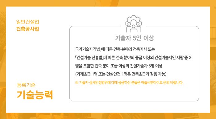 기술능력 기준으로는, 건축공사업에 규정된 자격을 갖춘 기술자 5인 이상을 보유해야 합니다.