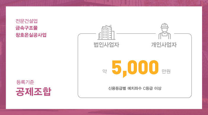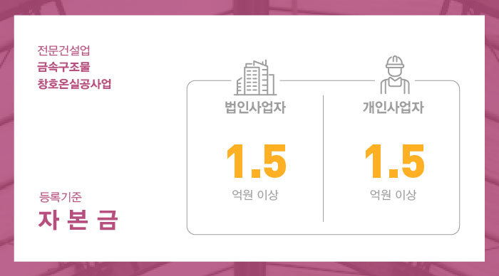 금속구조물창호온실공사업 면허 취득을 위해서는 법인 및 개인사업자 모두 1.5억 이상의 자본금을 준비해야 합니다.