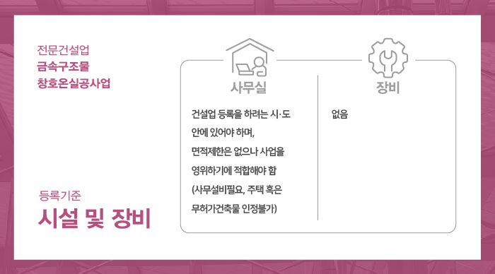 금속구조물창호온실공사업 면허 등록을 위한 장비에 대한 규정은 없으나 업무시설이 갖추어진 사무실은 반드시 준비되어야 합니다.
