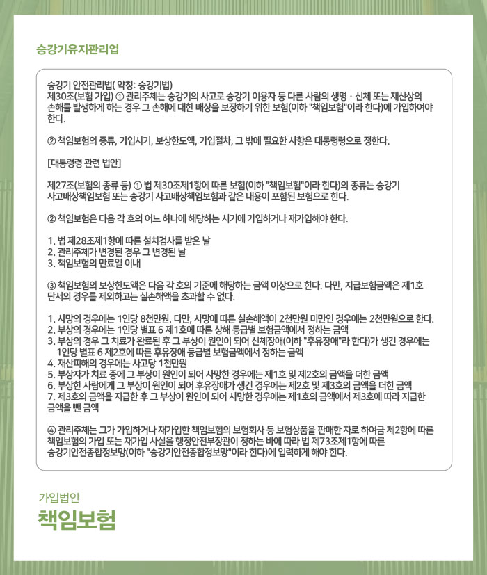 승강기유지관리업은 면허 등록 후, 책임보험에 가입해야 합니다.