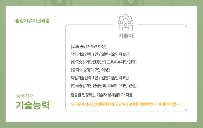 승강기유지관리업 기술능력 등록기준으로는, 고속승강기 9인 (책임기술인력 1인, 일반기술인력 8인), 중저속 승강기 7인 (책임기술인력 1인, 일반기술인력 6인) 이상의 기술자를 상시 보유해야 합니다.