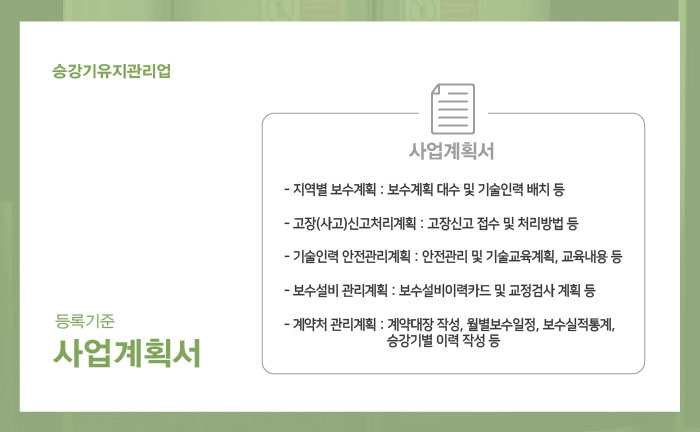 (사업 개요, 보유시설 및 장비, 보유인력 및 업무 수행 조직, 유지관리하려는 승강기의 종류, 유지관리용 부품 및 장비 등의 수급 계획, 기술인력 교육계획, 고장신고 접수 및 긴급출동 체계, 승강기에 갇힌 이용자의 신속한 구출을 위한 체계, 승강기 사고 등 긴급상황 접수 체계 및 운영계획 등 ...)