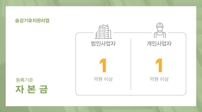 승강기유지관리업 면허 취득을 위해 충족되어야 할 자본금은 법인, 개인사업자 모두 1억원 이상으로