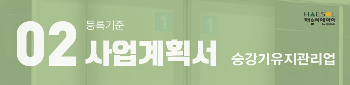 승강기유지관리업 면허 등록을 위해 중요한 부분 중 하나가 바로 사업계획서를 작성하는 것으로 사업 계획서 내에는 위와 같이 지역별 보수계획, 고장(사고)신고 처리 계획, 기술인력 안전관리계획, 보수설비 관리계획, 계약처 관리계획 등 상세한 사업 방향이 제시되어야 합니다.