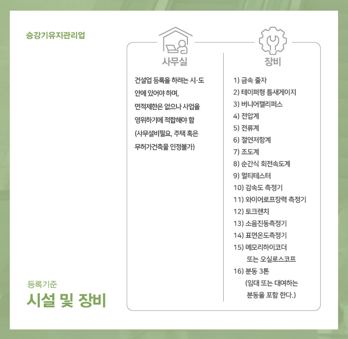 다음은 시설 및 장비 등록기준으로, 승강기유지관리업은 사무실과 장비가 모두 갖추어져야 합니다.
