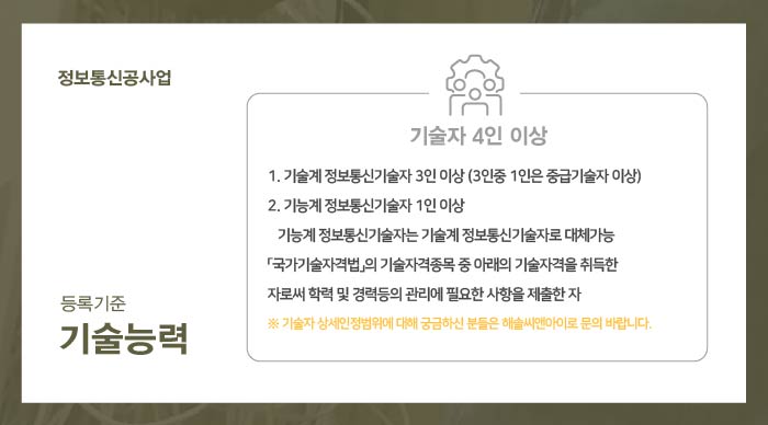 정보통신공사업 기술능력 기준 충족을 위해서는, 규정된 자격을 갖춘 4인 이상의 기술자가 보유가 필요합니다.