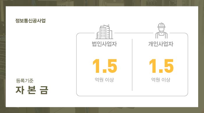 자본금 1억 5천만원 이상이 준비되어야 정보통신공사업 면허 등록이 가능하게 됩니다.