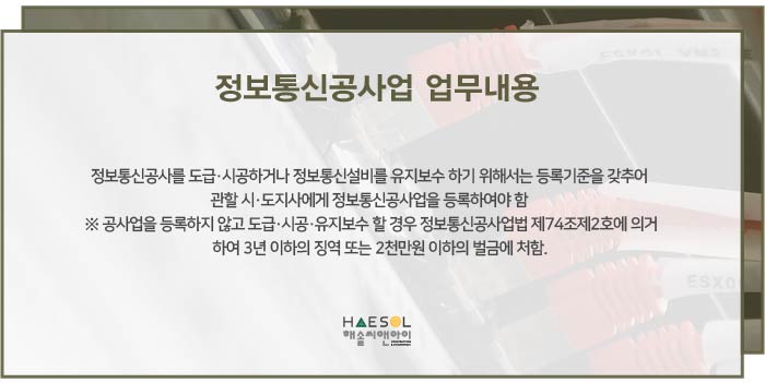정보통신공사업 면허는 정보통신공사를 도급, 시공하거나 정보통신설비를 유지보수하기 위해 반드시 필요한 면허로, 이를 위해서는 등록기준을 갖추어 관할 시·도 지사에게 정보통신공사업을 등록하여야 합니다. (만일, 공사업을 등록하지 않고 도급·시공·유지보수 할 경우에는 정보통신공사업법에 의거하여 법적 제재를 받게 됨을 인지하시기 바랍니다.)