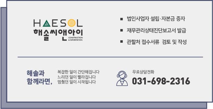 건설업 실질자본금에 관한 배경지식 없이 자본금 준비 과정은 다소 까다로울 수 있어 해솔씨앤아이와 같은 건설면허 전문가와 함께 회사의 제반사항에 관하여 면밀히 살펴본 후 자본금 준비를 진행하시는 것을 권장드리며, 관련한 도움이 필요하시다면 글 하단의 연락처를 통해 문의주시기 바랍니다.