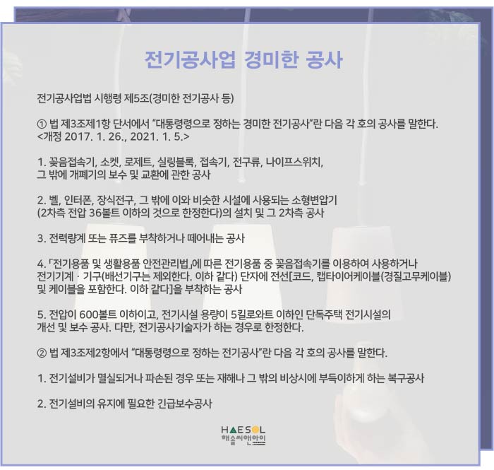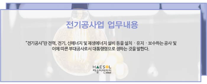 전기공사업 면허 등록에 대한 더 자세한 안내가 필요하신경우, 건설면허 전문가 해솔씨앤아이로 문의주시기 바랍니다!