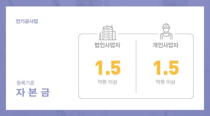 전기공사업 면허 등록의 진행을 위한 법인 및 개인사업자 모두 1억 5천만원 이상의 자본금 준비가 갖추어져야 합니다.