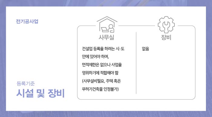 사무실은 전기공사업 면허 등록을 예정하는 시/도 안에 위치된 곳으로 준비가 되어야 하는데, 면적에 대한 법적 제한사항은 따로 없으나 컴퓨터, 책상, 인터넷, 팩스, 전화 등의 업무시설을 통해 기술자 및 임직원들의 근로가 가능한 충분한 크기의 공간으로서 준비가 되도록 해야 합니다.