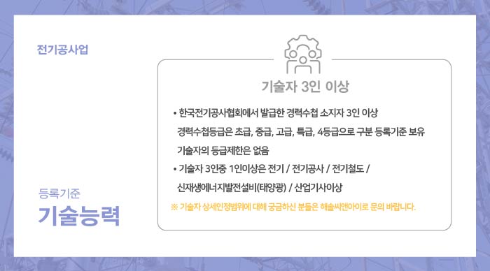 오늘은 전기공사업 면허 등록기준을 살펴보고 면허 접수 시 준비되어야 하는 사항을 함께 알아보겠습니다.