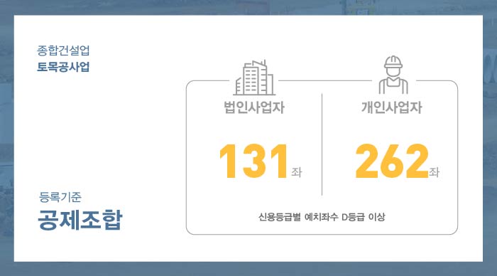 토목공사업 면허 등록을 위해서는 법인 5억이상, 개인사업자 10억이상의 자본금이 필요합니다.
