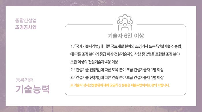 기술자는 국가기술자격법에 따른 국토개발분야의 조경기사 또는 한국건설기술인협회에서 발급하는 조경분야 중급 이상의 경력수첩보유자 중 2인을 포함한 조경분야 초급 이상의 경력수첩 보유자 4인 이상과 토목분야 초급 이상의 경력수첩 보유자 1인, 건축분야 초급 이상의 경력수첩 보유자 1인 이상으로 총 6인이 구성되어야 합니다.