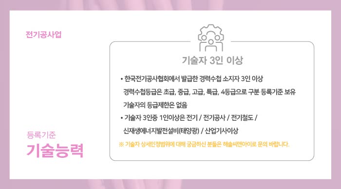 전기공사면허 기술능력 기준으로는 3인 이상의 기술자를 보유해야 합니다.