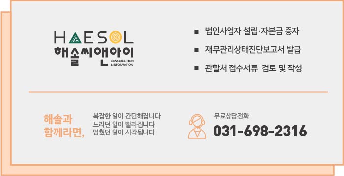 토목공사업 면허 등록을 위한 법인사업자 설립부터 자본금 증자, 기업진단보고서 발급과 관할처 접수서류 검토 및 작성에 이르기까지 면허 취득에 대한 도움이 필요하신 경우 건설면허 전문가 해솔씨앤아이로 문의주시기 바랍니다.
