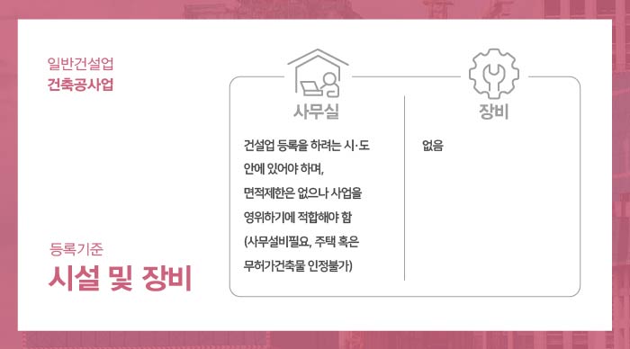 건축공사업 면허 등록을 위한 장비에 대한 규정은 없으나 업무시설이 갖추어진 사무실은 반드시 준비되어야 합니다.