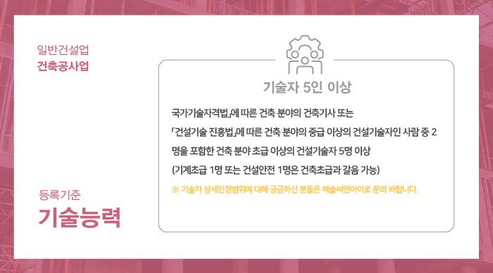 기술능력 기준으로는, 건축공사업에 규정된 자격을 갖춘 기술자 5인 이상을 보유해야 합니다.