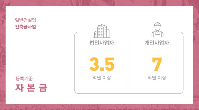 건축공사업 면허 취득을 위해서는 법인 및 개인사업자 모두 1.5억 이상의 자본금을 준비해야 합니다.