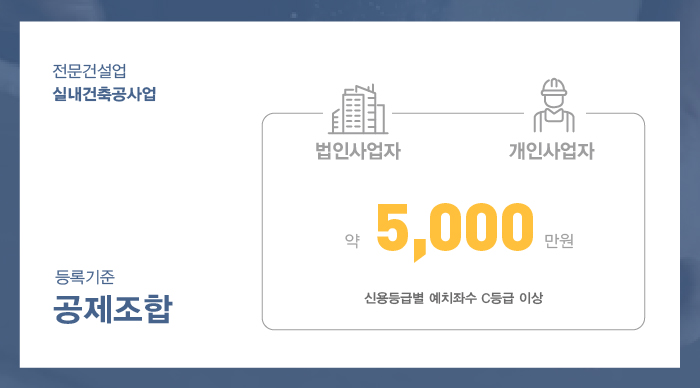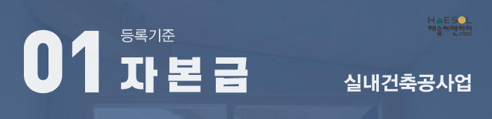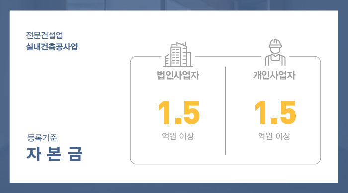 실내건축공사업 면허 등록을 하기 위해서 준비되어야 하는 자본금은 법인 및 개인사업자 동일한 1억 5천만원 이상입니다.