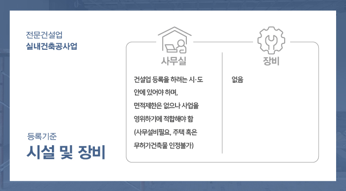 사무실은 실내건축공사업면허 등록을 예정하는 시/도 안에 위치한 곳으로 면적에 대한 법적 제한사항은 없지만 컴퓨터나 책상, 인터넷, 팩스, 전화 등의 업무시설이 준비 된 곳으로 기술인력 및 임직원들의 근로가 가능할 수 있는 충분한 크기의 공간으로서 준비를 해 주셔야 합니다.