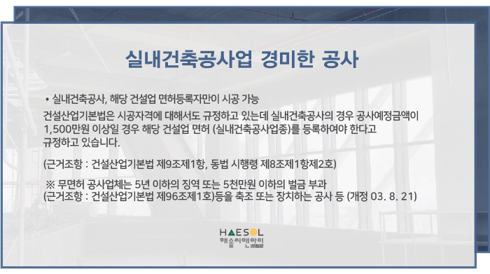 건설산업기본법은 시공자격에 대해서도 규정하고 있으며, 공사예정금액이 1,500만원 이상일 경우 해당 건설업 면허(실내건축공사업종)를 등록하여야 합니다.