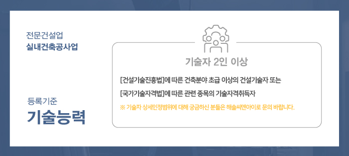 기술자는 한국건설기술인협회에서 발급하는 건축 분야 초급 이상의 경력수첩 소지자 또는 관련 종목의 국가기술자격증을 취득한 기술자격취득자로서 1인 1자격만 인정되기 때문에 2인 이상이 구성될 수 있도록 해야 합니다.