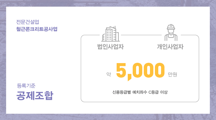철근콘크리트공사업 면허 등록 진행을 위해 법인과 개인사업자 모두 1억 5천만원 이상의 자본금 준비가 필요합니다.