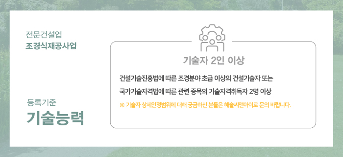 기술자는 한국건설기술인협회에서 발급하는 조경 분야 초급 이상의 경력수첩 소지자나 국가기술자격법에 따른 관련 종목의 기술자격을 취득한 분으로 총 2명 이상이 필요합니다.