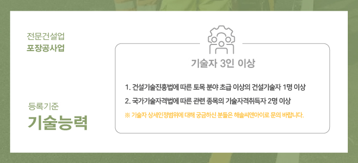 자격 요건은 건설기술진흥법에 따른 토목분야 초급 이상의 건설기술자 1명 이상, 국가기술자격법에 따른 관련 종목의 기술자격취득자 2명 이상여야 하며 국가기술자격의 상세인정범위에 대하여 궁금하신 경우 해솔씨앤아이로 문의주시면 해당 자격사항에 관하여 안내드리도록 하겠습니다.