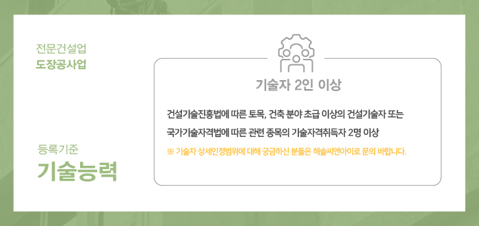 기술인력 2인은 면허 등록을 할 때 뿐만 아니라, 면허를 보유하는 전 기간동안 상시 유지되어야 하는 부분으로, 기술자의 퇴사 등으로 인하여 등록기준에 공백이 발생될 경우 발생일로부터 50일 이내 자격사항을 갖춘 새로운 기술자가 충원되어야 하는 점 꼭 기억하여 주시기 바랍니다.