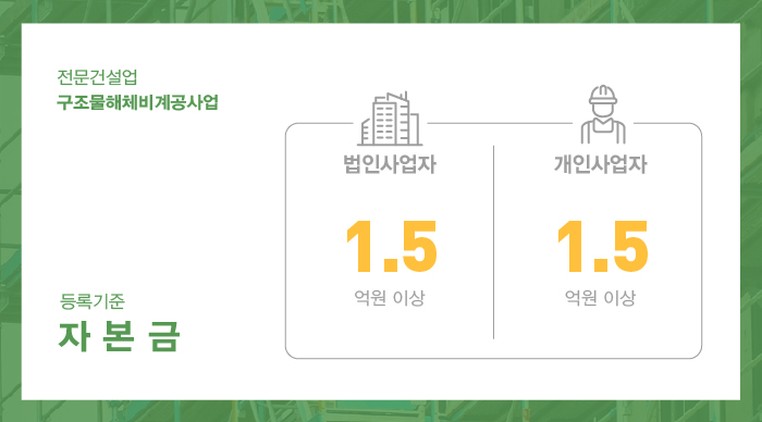 구조물해체비계공사업은 전문건설공제조합을 통해 법인 및 개인사업자 모두 약 5천만원 가량의 금액을 출자금으로 예치하여 주신 후, 보증가능금액확인서를 발급받아 면허 접수 시 제출하여 주시는 것으로 자본금 기준금액 이상의 금액에 대하여 보증의무를 부담한다는 내용을 증빙하여 주셔야 면허 취득을 하실 수 있습니다.