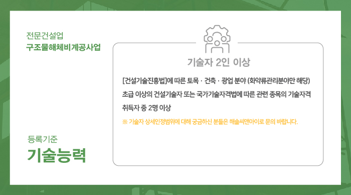 구조물해체비계공사업 실무 운영이 가능한 기술자 2인 이상이 확보되어야 합니다.