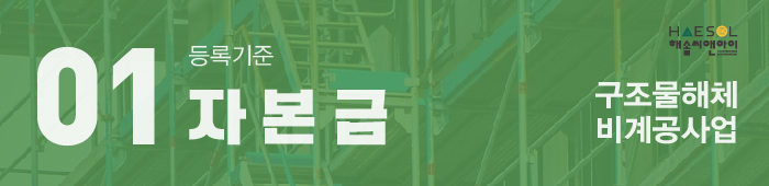 구조물해체비계공사업 면허 등록을 위한 자본금 1억 5천만원 이상의 준비를 해 주셔야 합니다.