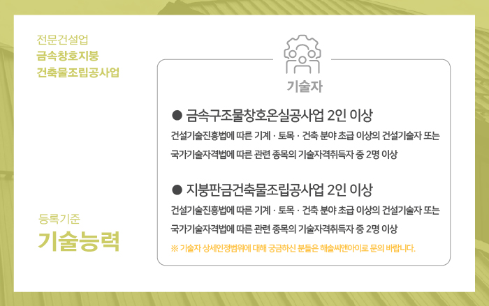 그리고 모든 기술자는 반드시 금속창호지붕건축물조립공사업 면허 등록을 예정하는 회사에 상시근로자로서 근무하도록 해야 하기 때문에 다른 회사에 이중소속되어 근로하거나 별도의 사업체 운영 등을 하지 않도록 해야 함을 유의 해 주셔야 합니다.