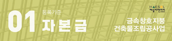 또한 개인사업자 및 법인사업자 모두 실질자본금으로서 등록기준 이상을 준비하면 되지만 법인사업자는 법인등기부등본상 납입자본금도 등록기준 이상이 충족되어야 하며 사업목적란에 금속창호지붕건축물조립공사업에 대한 목적이 반드시 기재되어야 합니다.