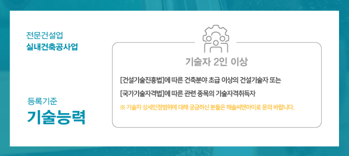실내건축면허 실무 운영 기술자 2인 이상이 필요합니다.