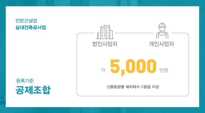 법인 및 개인사업자 모두 약 5천만원 가량의 출자금 예치가 진행되어야 실내건축면허 등록을 진행할 수 있게 됩니다.