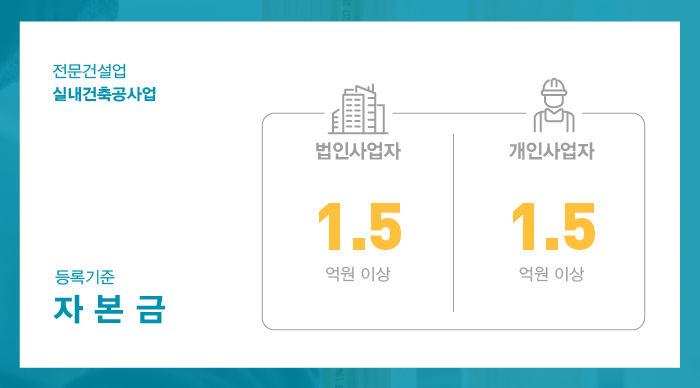 실내건축면허 등록의 진행을 위해서는 법인과 개인사업자 모두 1억 5천만원 이상의 자본금을 준비해야 합니다.
