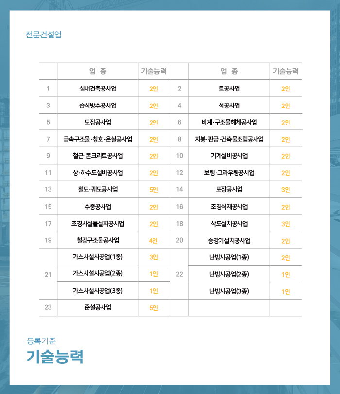 전문건설업 면허 등록을 위해 준비해야 하는 기술인력은 다음의 자격요건을 충족해야 하는데, 1인 1자격만 인정되기 때문에 최소 인력의 수로 구성될 수 있도록 준비되어야 합니다.