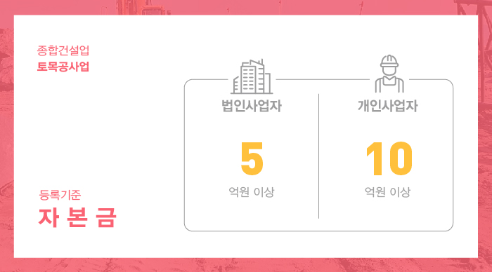 토목공사업 면허 등록의 진행을 위해서는 법인 5억 이상, 개인사업자 10억 이상의 자본금을 준비해야 합니다.