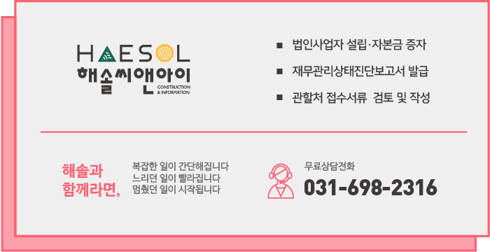 지금까지 토목공사업 면허 등록기준과 절차에 대해 안내드렸습니다. 해솔씨앤아이에서는 법인 설립부터 자본금 증자, 기업진단보고서 발급, 관할처 접수서류 검토 및 작성까지 면허 등록과 관련한 모든 업무를 진행하고 있으니, 이에 대해 궁금한 사항이 있거나 도움이 필요하실 경우 언제든지 문의주시기 바랍니다.