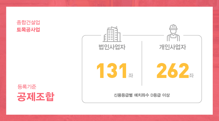 개인사업자 및 법인사업자 모두 준비해야 하는 실질자본금을 준비해야 하지만, 법인사업자는 법인등기부등본상 납입자본금 또한 5억 이상 될 수 있도록 함께 준비해야 하며, 사업목적란에 토목공사업에 관한 목적이 기재될 수 있도록 해야 합니다.