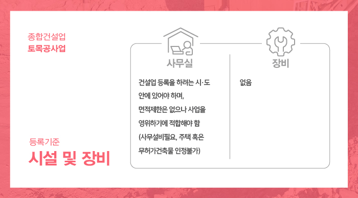 사무실은 건설업 면허 등록을 예정하는 시/도 안에 위치되어야 하며, 법적으로 제한된 면적의 크기는 없으나 업무시설(컴퓨터, 책상, 인터넷, 팩스, 전화 등)을 갖추어 기술인력 및 임직원들이 근로하기 적합한 크기의 공간으로서 준비가 되어야 합니다.