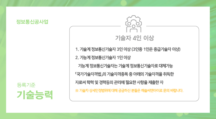 정보통신공사업 기술능력 기준 충족을 위해서는, 규정된 자격을 갖춘 4인 이상의 기술자가 보유가 필요합니다.