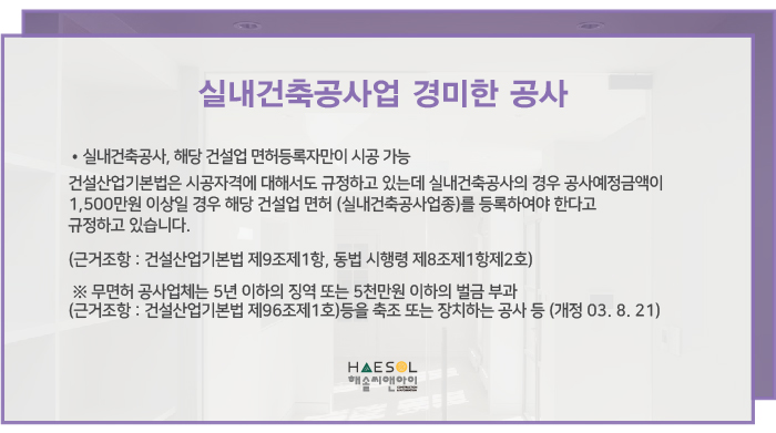 건설산업기본법은 시공자격에 대해서도 규정하고 있으며, 공사예정금액이 1,500만원 이상일 경우 해당 건설업 면허(실내건축공사업종)를 등록하여야 합니다.