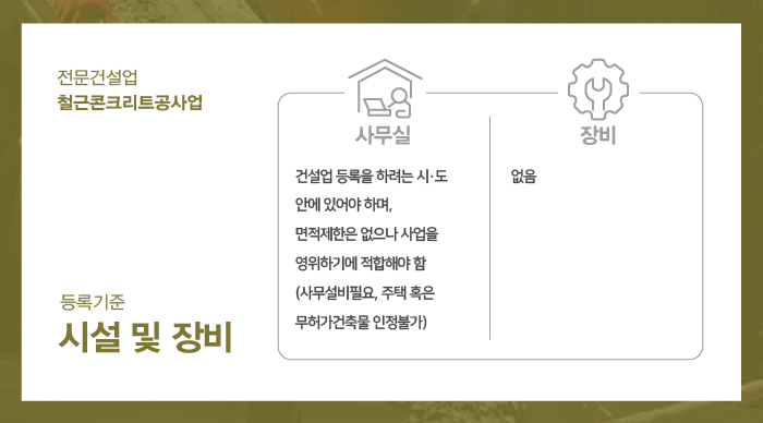 철근콘크리트공사업은 장비에 대한 필수 기준은 없지만 면허등록을 하기 적격한 사무실의 준비가 필수로 필요합니다.